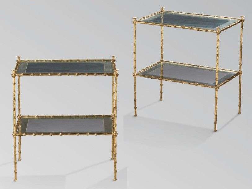 Paire de bouts de canapés à deux plateaux superposés partiellement miroir reposant sur une structure en bronze doré imitant le bambou. Vers 1950.