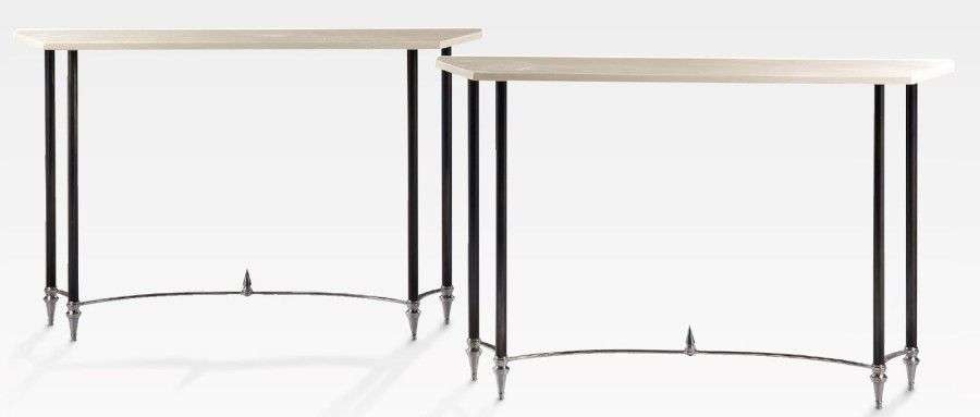 Pair of consoles in chromed and patina metal.