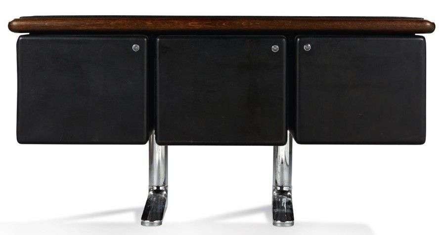 Meuble en chêne ouvrant en façade par trois portes gainées de cuir noir reposant sur deux montants coudés en métal chromé.
