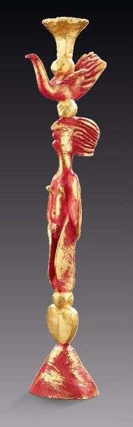 Pied de lampe en bronze doré patiné rouge figurang une femme et un oiseau stylisés.