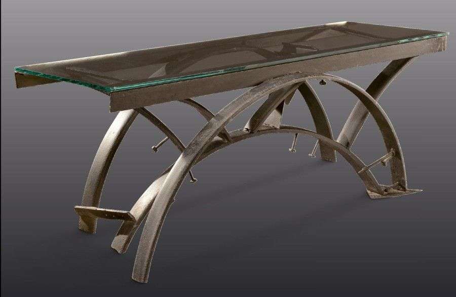 An exceptional sculpture forming a desk with a thick plate glass top on a base composed of an assembly of pieces of cast iron and iron soldered together.