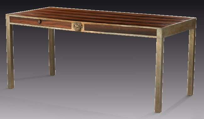 Bureau rectangulaire en bronze patiné et placage d'ébène de macassar toutes faces ouvrant par deux tiroirs en façade et d'une tête de lion en relief. Signé, numéroté et daté, "Chauvat LifiFonderie d'art 2008" 1/8.