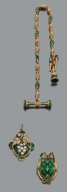 Ensemble en or jaune 18k et émail vert composé d'une chaine de montre, une broche et un pendentif sertis de diamants de taille ancienne et de petites perles.