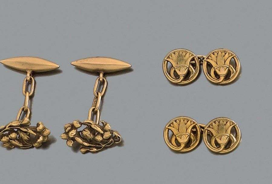 Ensemble de deux paires de boutons de manchettes en or jaune 18k ciselé d'un décor floral. Vers 1900