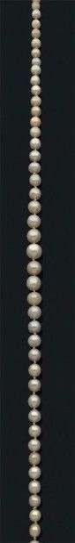 Collier composé d'une chute de 58 perles fines et 5 perles de culture. Fermoir bâton en or gris 18k serti de diamants taillés en rose. Poids: 22.5gr Accompagné d'un certificat LFG N° 317773 attestant perles fines, eau de mer et précisant la position des perles de culture. Diam.: 5.2 - 8.4 mm env.