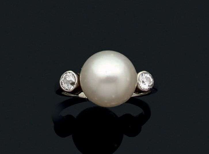 Bague en or jaune 18k sertie d'une perle fine épaulée de deux diamants de