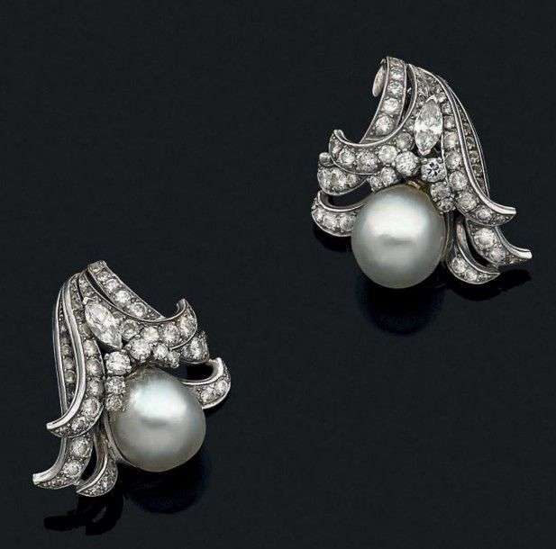 Paire de motifs d'oreilles en platine et or gris 18k sertis de diamants taille brillant rehaussés d'un diamant taille navette et sertis d'une perle de culture baroque.