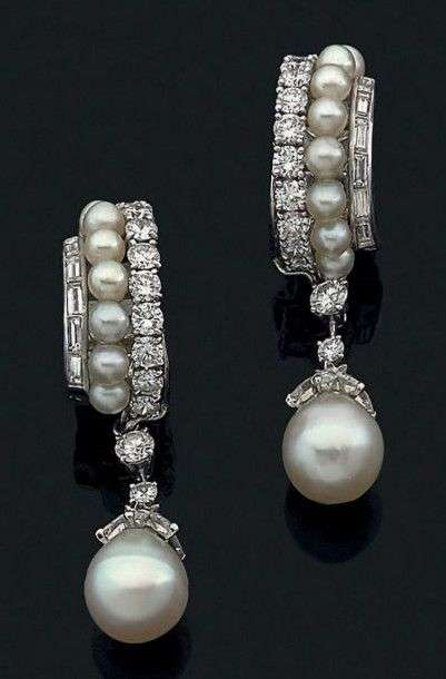 BOUCHERON Paire de pendants d'oreilles en or gris 18k et platine composés d'un motif circulaire serti d'une ligne de diamants baguettes, une ligne de petites perles de culture et une ligne de brillants, retenant en pampille un élément amovible serti d'une chute de diamants et d'une perle de culture. Signature sur un clip. Dans un écrin. Haut: 4.8 gr Pb: 19.3 gr