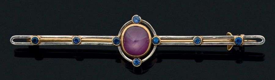 Broche "barrette" en or jaune et gris 18k sertie au centre d'un rubis étoilé rehaussé de saphirs. Dans un écrin Mauboussin