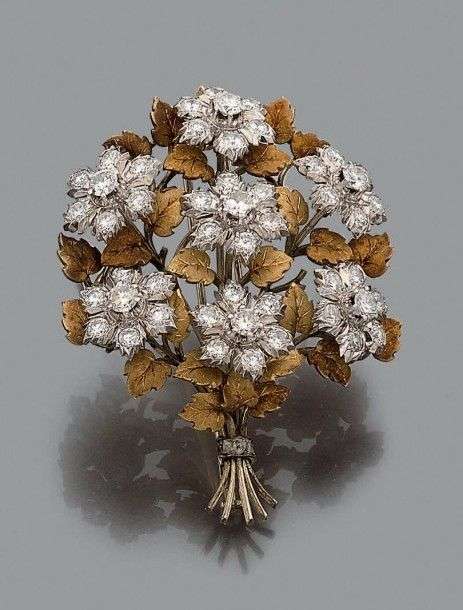 Grande broche "bouquet de fleurs " en or jaune et gris 18k serties de diamants de taille brillant.