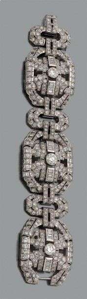 Bracelet articulé en platine à décor ajouré géométrique serti de diamants demi taille, brillant et baguette et rehaussé de trois diamants plus importants.