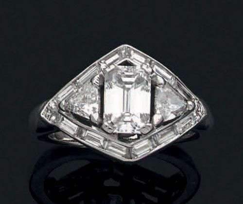 Bague en or gris 18k sertie d'un diamant de taille émeraude épaulé de deux diamants triangles dans un entourage losangique de diamants baguettes. Tour de doigt: 52 Pb: 5.8 gr Accompagnée d'un certificat GIA précisant Poids: 1.32 carats Couleur: D Pureté: VS2