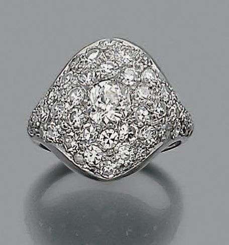 Bague en platine composée d'un pavage de diamants huit huit rehaussé au centre d'un diamant de taille ancienne.