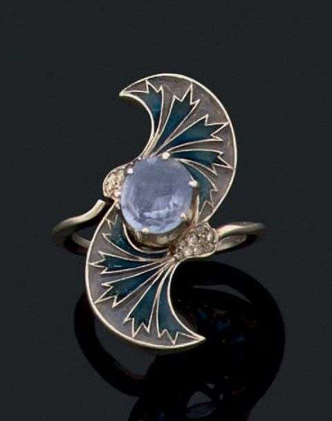 Bague en platine sertie d'un saphir rond enlacé de deux motifs ornés d'émail plique à jour bleu rehaussés de brillants. Vers 1900.