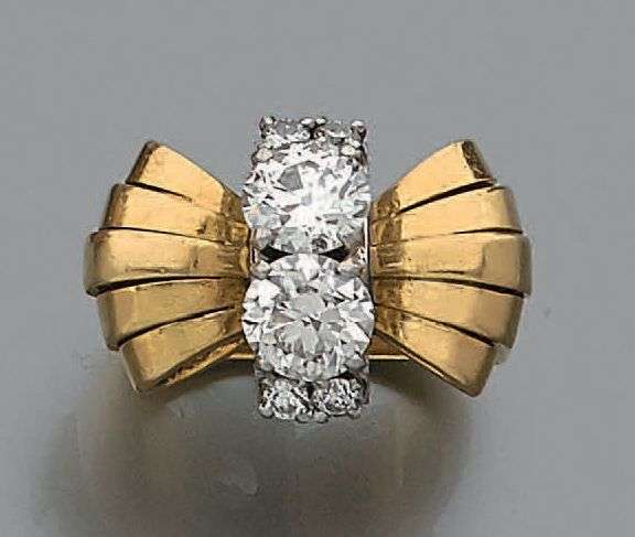 Bague "noeud" en or jaune et platine sertie au centre de deux diamants de