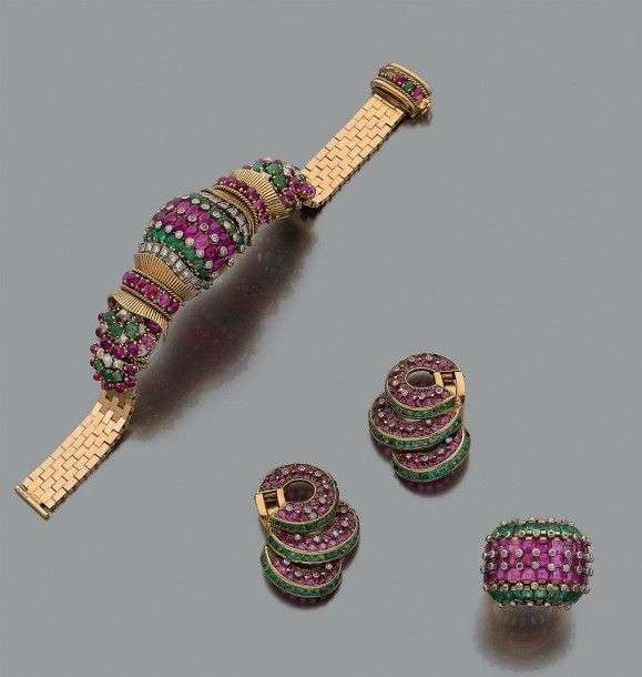 Ensemble composé d'un bracelet, une bague et une paire de clips d'oreilles en or jaune 18k sertis de rubis et émeraudes rehaussés de petits diamants en sertis clos.