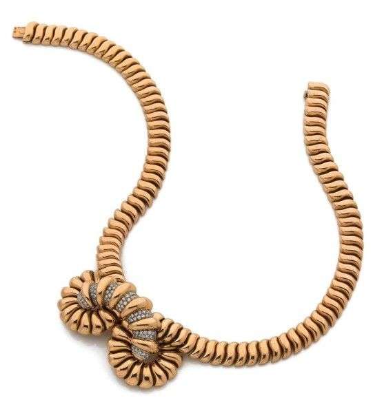 Collier en or jaune 18k composé de motifs ondulés dessinant au centre deux rouleaux rehaussés d'un clip godronné en or jaune alterné de pavages de diamants huit huit. Système à transformation.