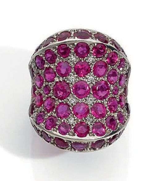 Importante bague en platine composée d'un large anneau incurvé pavé de rubis rehaussés de petits diamants dans le sertissage. Poinçon de maître Groené & Darde partiellement lisible. Dans un écrin.