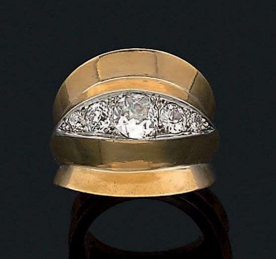 SUZANNE BELPERRON Bague en or jaune 18K et platine sertie d'une ligne de diamants de taille ancienne en chute entre deux zones concaves. Poinçon de maître Groene & Darde. Tour de doigt: 52 Pb: 12 gr Accompagnée d'un certificat de Monsieur Olivier Baroin attestant que cette bague a été réalisée entre 1945 et 1955.