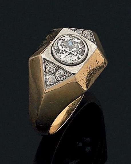SUZANNE BELPERRON Bague chevalière à pans coupés en or jaune 18k et platine sertie d'un diamant de taille ancienne épaulé de deux pavages triangulaires sertis de diamants de taille ancienne.Trace de poinçon Groené & Darde. Poids du diamant: 1.14 carats Tour de doigt: 60 Pb.: 8.8 gr Accompagnée d'un certificat de Monsieur Olivier Baroin attestant que cette bague a été réalisée en février 1943.
