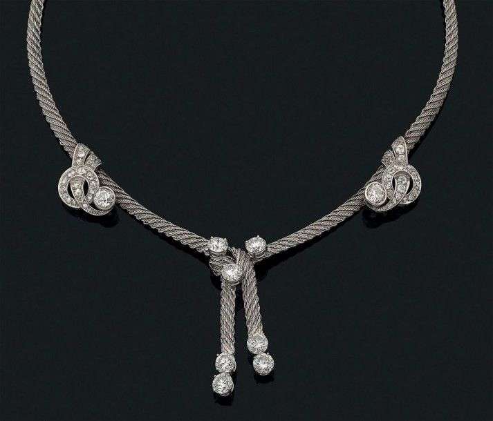 Collier en or gris tressé 18k orné d'un noeud central rehaussé de sept diamants de taille brillant et épaulé de motifs à enroulement serti de diamants de taille ancienne.