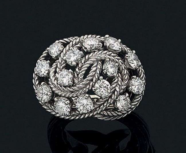 Bague en platine composée d'anneaux enlacés sertis de diamants de taille brillant. Poinçon de maître. Vers 1960
