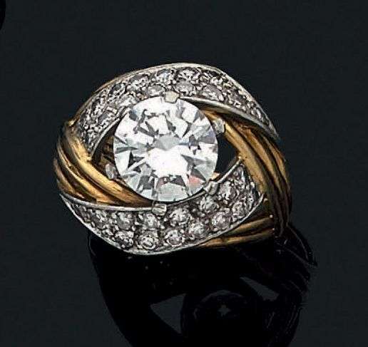 # Bague en or jaune 18K sertie d'un diamant de taille moderne entre deux volutes en or gris 18k serties de brillants.