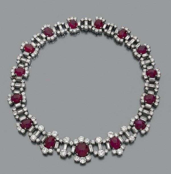 Important collier articulé en platine et or gris 18k serti d'une chute de 15 rubis cabochons rehaussés de diamants de taille brillant et alternés de diamants baguettes et brillants. Peut se porter en deux bracelets. Vers 1950. Long: env. 38 cm Pb: 139.8 gr