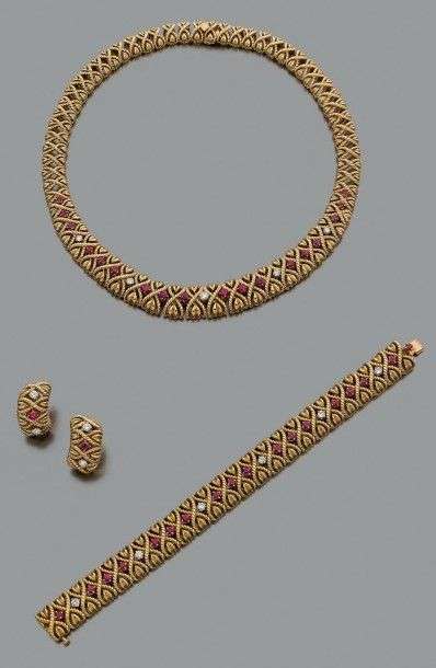 Parure en or jaune 18k composée un collier, un bracelet et une paire de clips d'oreilles en fils d'or torsadé, tressé et ajouré sertis de rubis et de diamants de taille brillant. Signés et numérotés. Ecrin