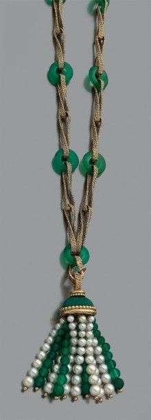 GEORGES LENFANT Sautoir en or jaune tressé alterné d'anneaux de chrysoprase et retenant un pendentif amovible composé d'un pompon orné de perles de chrysoprase et de perles de culture. Poinçon de maître sur le pendentif. Vers 1970. Long du sautoir: env. 84 cm Haut. du pendentif: 8.5 cm Pb.: 113 gr