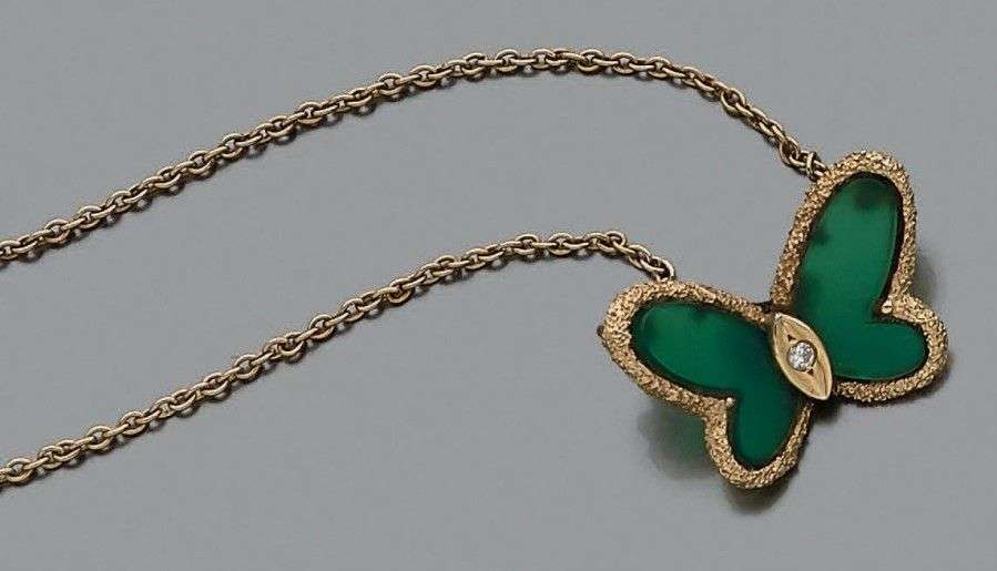 Collier composé d'une chaine en or jaune 18k orné d'un motif "papillon" en chrysoprase serti de brillants.