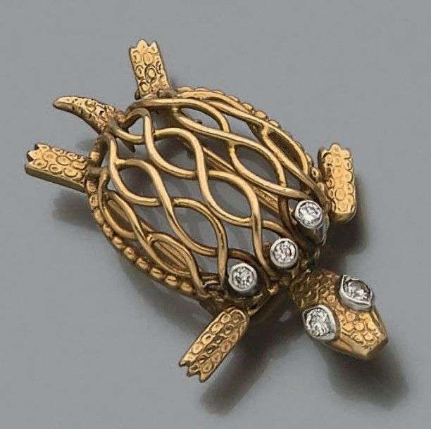 Clip "tortue" en or jaune 18k rehaussé de cinq brillants. Signée et numérotée.