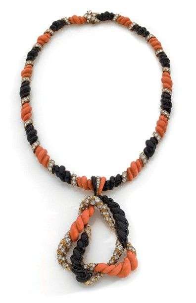 Ensemble composé d'un collier articulé en or jaune 18k composé de motifs torsadés de corails et d'onyx alternés d'anneaux sertis de diamants retenant au centre d'un important pendentif assorti pouvant également se porter en broche.