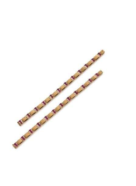 Paire de bracelets articulés en or jaune 18K composés de maillons ciselés alternés de maillons ajourés sertis de rubis. Peut se porter en collier.