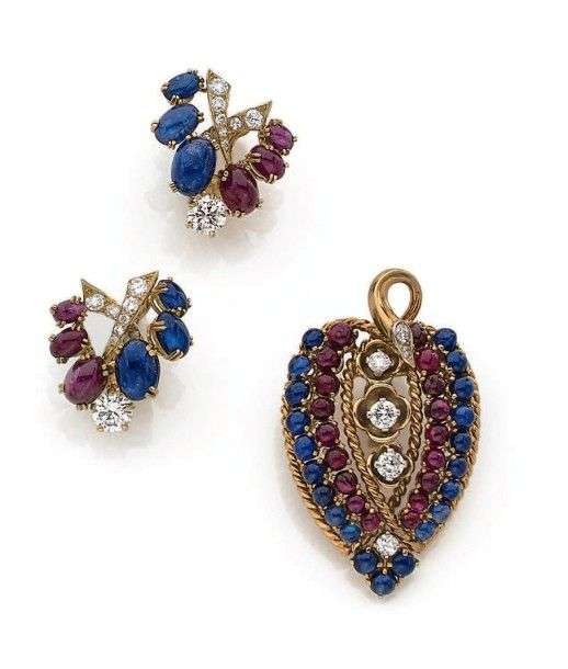 Ensemble en or jaune 18k composé d'une paire de motifs d'oreilles et un pendentif sertis de rubis et saphirs cabochons rehaussés de diamants de taille brillant.