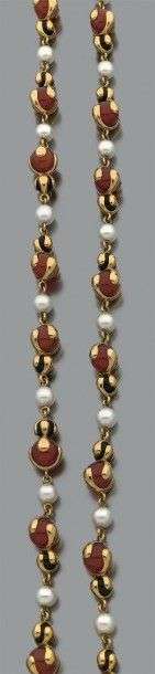 Sautoir en or jaune 18k composé de perles de culture alternées de perles d'onyx et de cornaline.