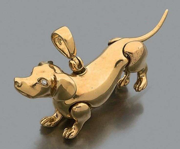 Pendentif "teckel" articulé en or jaune 18k serti de brillants pour les yeux. Signé.