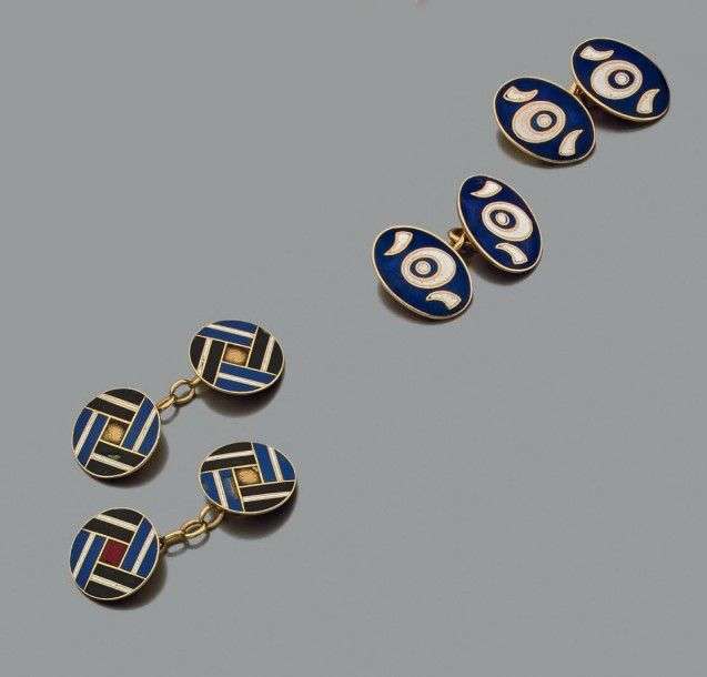 Ensemble de deux paires de boutons de manchettes en or jaune 18k et décor émaillé.