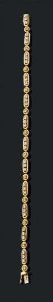 Bracelet articulé en or jaune 18k composé d'une aternance de motifs sertis de diamants jaunes et de diamants blancs. Signé et numéroté.