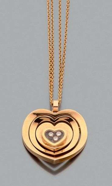 Pendentif "Very chopard" en or jaune 18k composé de trois coeurs articulés légèrement galbés et sertis au centre de trois diamants de taille brillant mobiles.