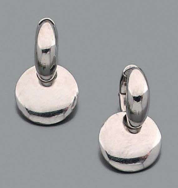 Paire de pendants d'oreilles en or gris 18k, motifs ronds. Signée.