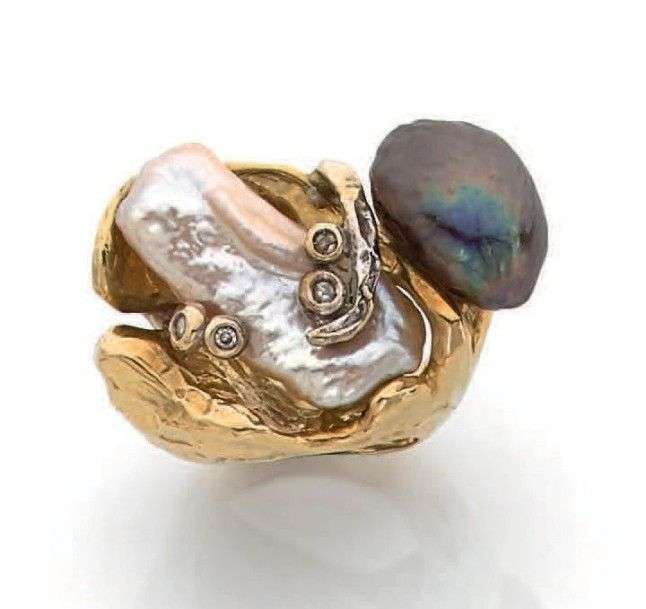 Bague en or jaune 18k martelé ornée de deux motifs de nacre blanche et gris sertis de petits brillants.