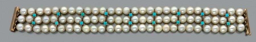 Bracelet composé de trois rangs de perles de culture rehaussés de barrettes serties de turquoises. Signé et numéroté.