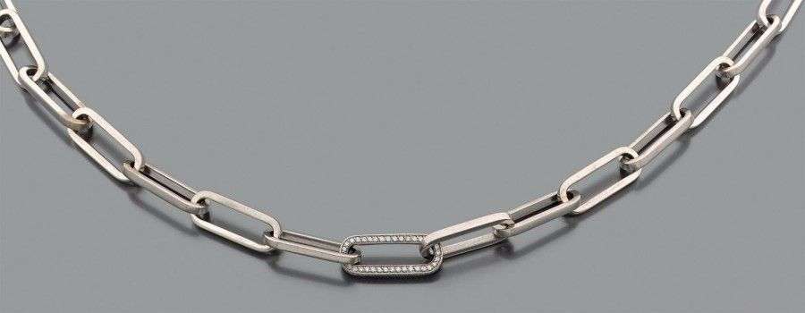 Collier en or gris 18k composé de long maillons articulés, l'un rehaussé de brillants. Signée et dans son écrin.