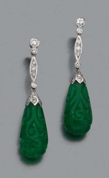 Paire de pendants d'oreilles en or gris 18k composé d'un motif serti de diamants de taille brillant retenant une perle de jade gravée