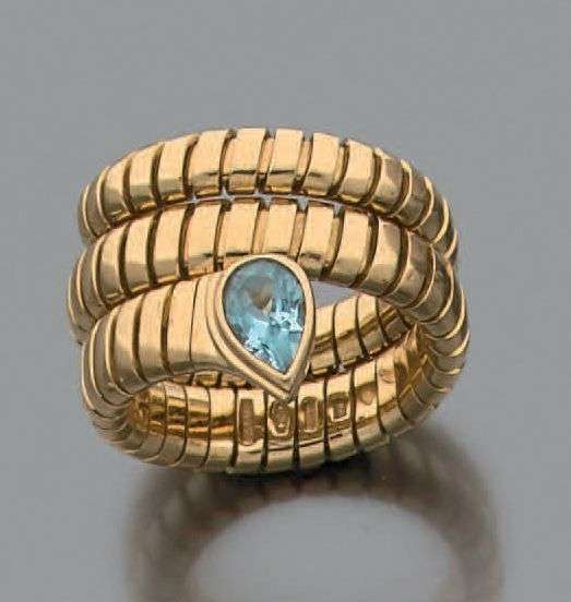 Bague tubogaz "serpent" en or jaune 18k sertie d'une aigue marine en poire. Signée. Dans son écrin.