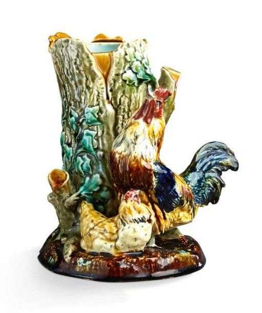 Vase au coq et à la poule en faience polychrome