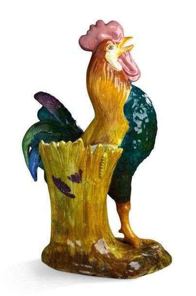 Grand porte bouquet au coq en faîence émaillée polychrome.