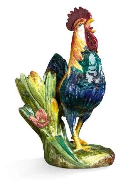 Sculpture en céramique émaillée polychrome figurant un coq formant porte plantes.