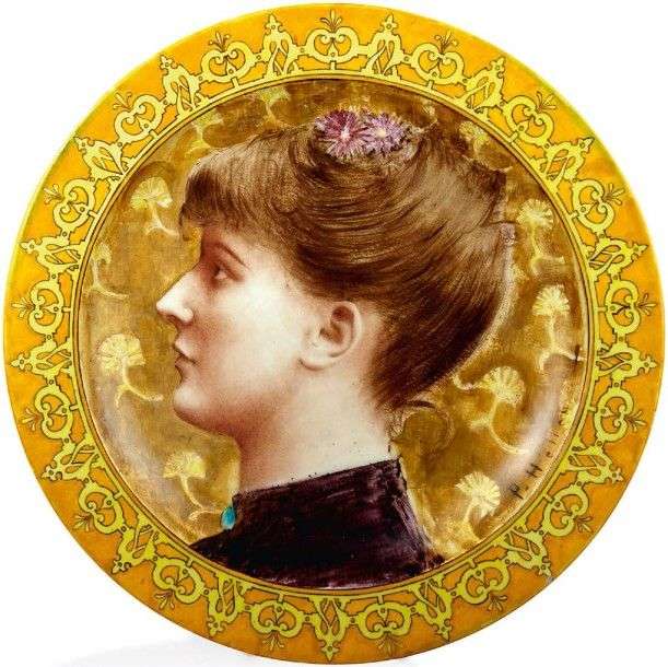 Plat circulaire creux en céramique émaillée à décor d'un portrait de femme de profil sur fond ocre.